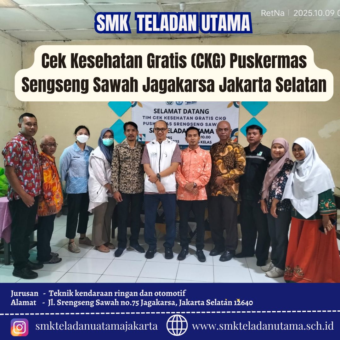 Jagakarsa, 9 Oktober 2025 — SMK Teladan Utama bekerja sama dengan Puskesmas Jagakarsa mengadakan kegiatan Cek Pemeriksaan Kesehatan Gratis bagi siswa, guru, dan tenaga kependidikan. Kegiatan ini merupakan salah satu bentuk kepedulian sekolah terhadap pentingnya menjaga kesehatan warga sekolah.